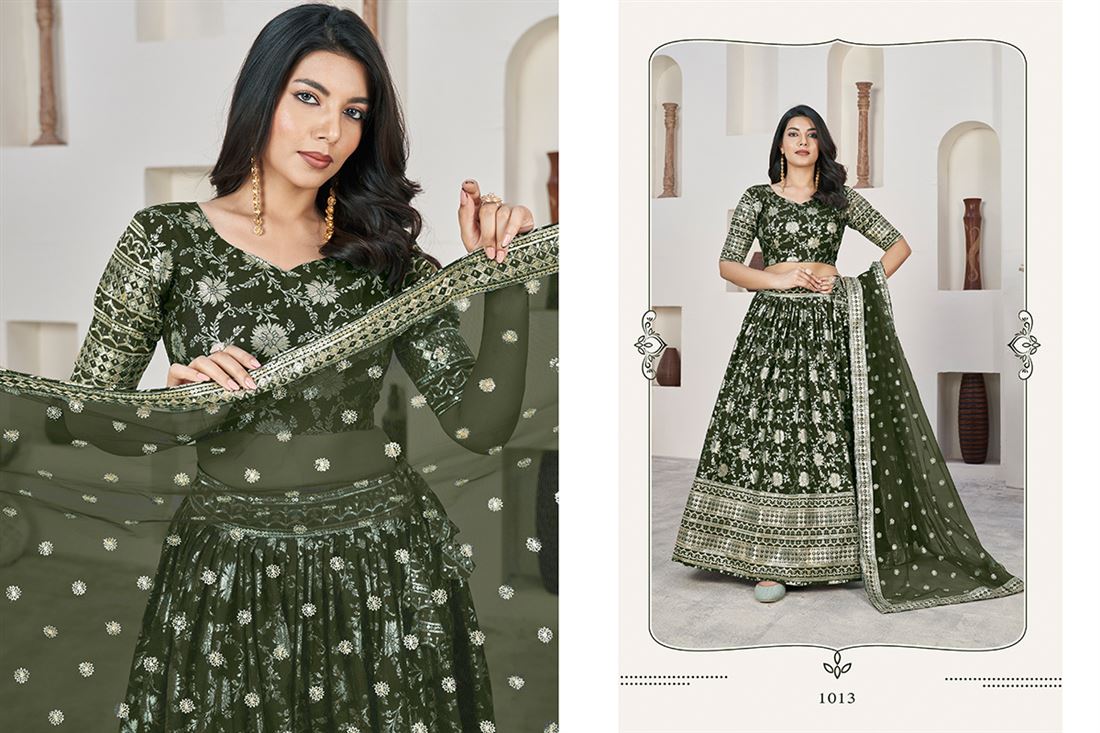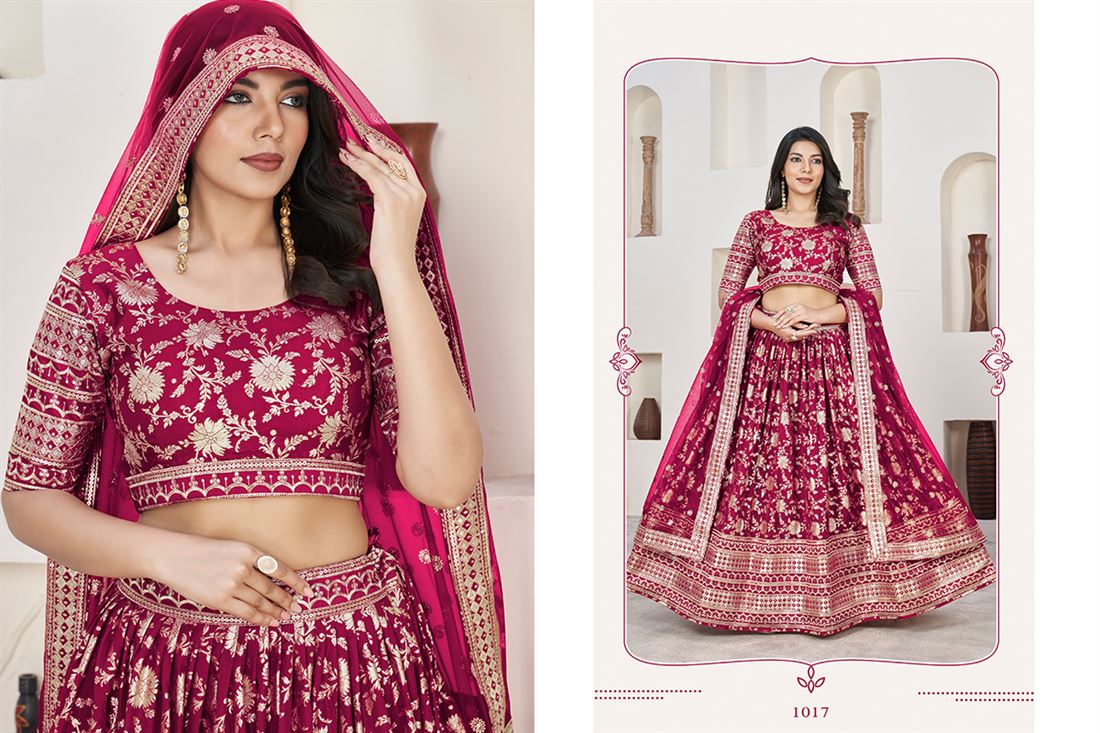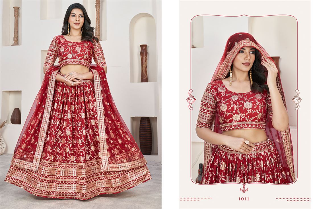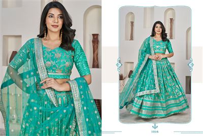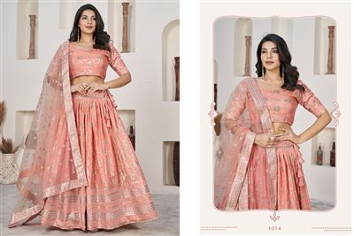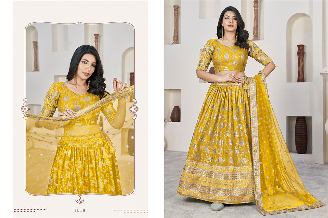 Embrace luxury and tradition with our AALISHA VOL-1 lehenga choli. This gorgeous outfit is a must-have for weddings and special occasions, showcasing stunning jacquard sequins and zari embroidery. Pair it with the lovely dupatta for a sophisticated and timeless look that will make you stand out this wedding season. Additional 12% GST Applicable.